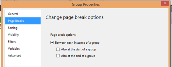 Check the “Between each instance of a group” option in Page Breaks from the left pane.