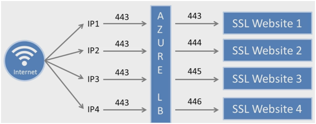 As shown above, we see from the Internet that multiple IP addresses are requesting a resource over the same port – a secured HTTP port here of 443. All of those requests are coming in over the same port. They hit the Azure load balancer. That can then be distributed by port number to, in this case, four different SSL web sites but each one implementing a different port number. So we can distribute it again at that transport layer level using port forwarding.