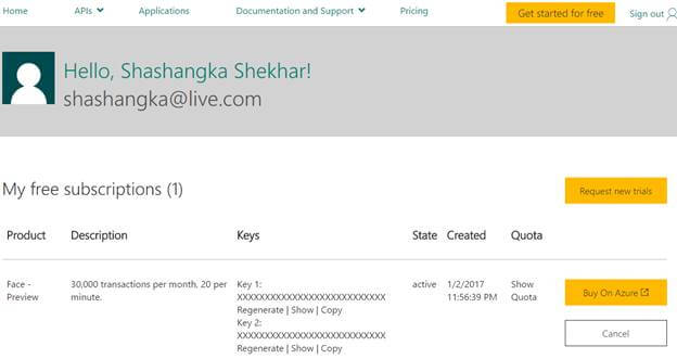 In this post, we are focusing on detecting faces so before we deal with the sample application, let’s take a closer look on API Reference (Face API - V1.0). To enable the services, we need to get an authorization key (API Key) by signing up with the service for free. Go to the link for signup.