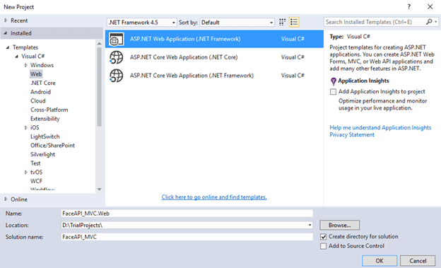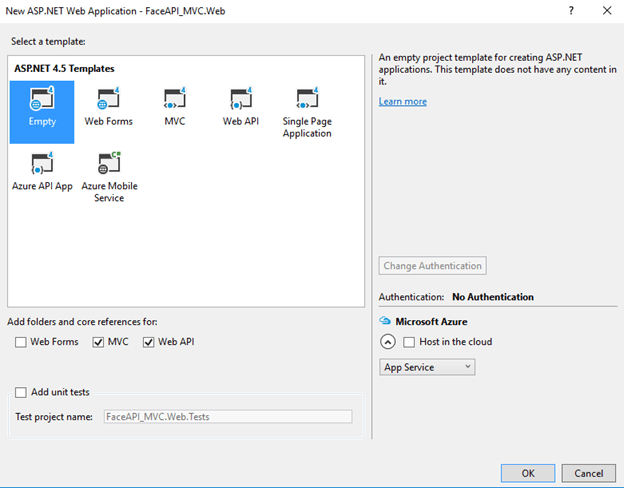Select ASP.NET Web application, name it as you like, I just named it “FaceAPI_MVC”. Click OK button to proceed for next step.