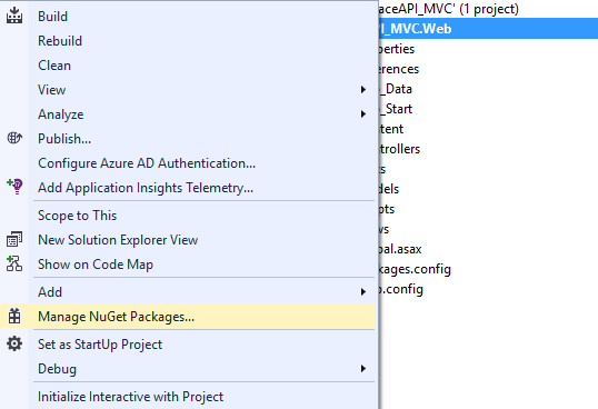 We need to add packages in our sample application. To do that, go to Solution Explorer and right click on Project > Manage NuGet Package.