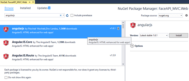 In "Package Manager", search by typing “angularjs”, select package, then click "Install".