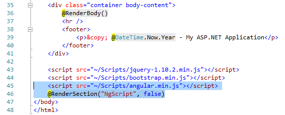 After installing “angularjs” package, we need to reference it in our layout page. Also, we need to define app root using “ng-app” directive.