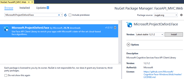 We need to add “Microsoft.ProjectOxford.Face” library in our sample application. Type and search like below screen, then select and Install.