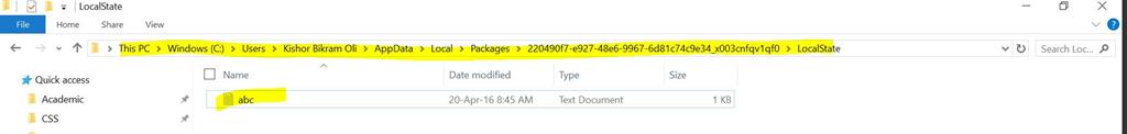 27.                 StorageFolder folder = ApplicationData.Current.LocalFolder;