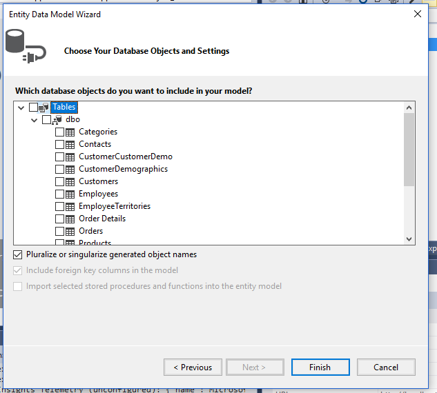 Then Choose Model Content Code First from Database. You can create other Model Contents too based on your requirement. Then create your connection string which will be saved in Web.Config file. Now from Choose your Database Objects and Settings select Tables you need and click Finish.