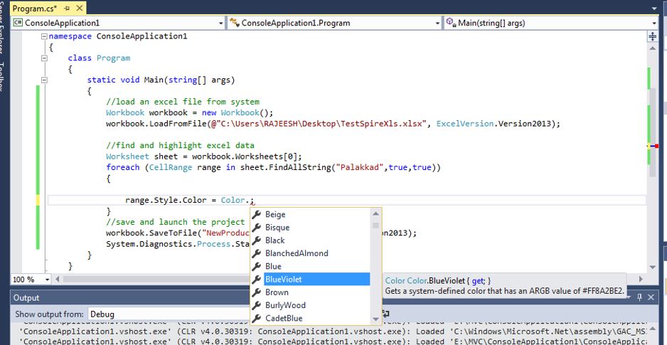 The following code contain “Spire.Xls”. This library contains the functionality of highlight data in excel,Excel Version,Excel Location,etc.