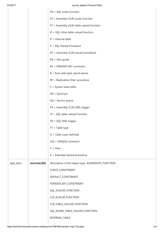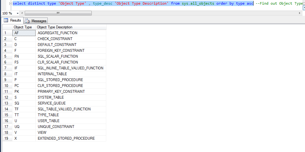 - select distinct type 'Object Type' , type_desc 'Object Type Description' from sys.all_objects order by type asc