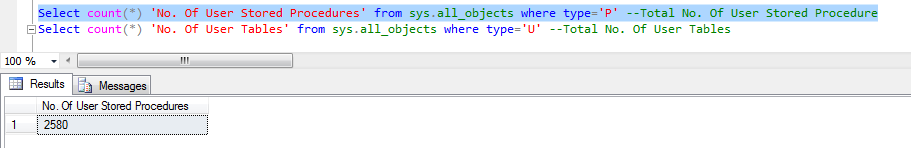 - Select count(*) 'No. Of User Stored Procedures' from sys.all_objects where type='P'