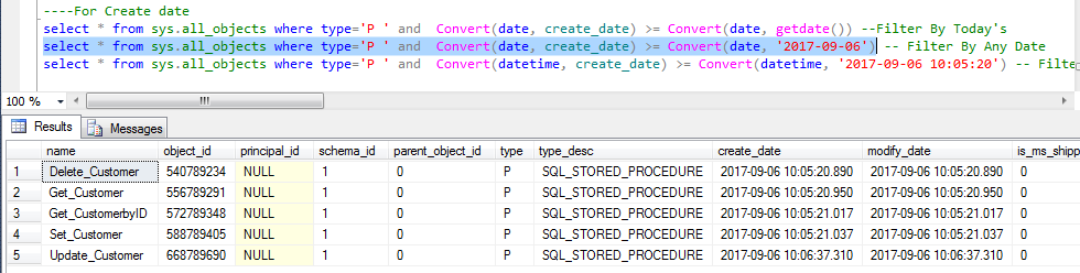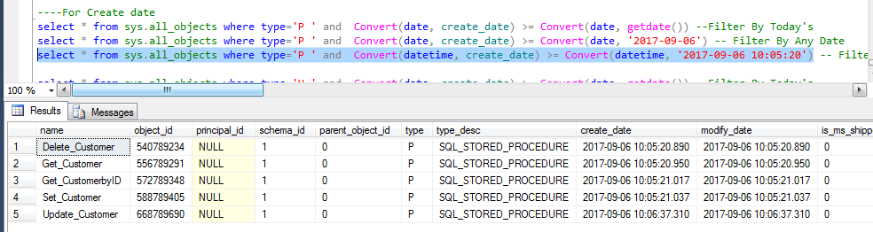 Filter By Any Date.- select * from sys.all_objects where type='P ' and Convert(date, create_date) >= Convert(date, '2017-09-06')