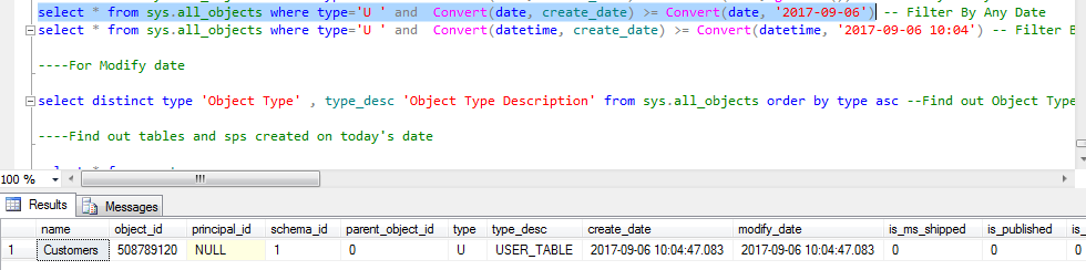Filter By Any Date.- select * from sys.all_objects where type='U ' and Convert(date, create_date) >= Convert(date, '2017-09-06')