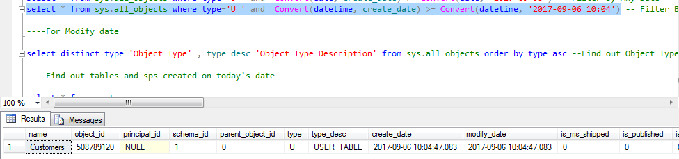 - In the second line, I put built in function "Convert in where" clause where I mentioned the date format of create_date column of the sys.all_objects and compared with the only date '2017-09-06'.