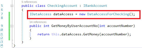 In the example CheckingAccount Class has a direct dependency with DataAccessForChecking.