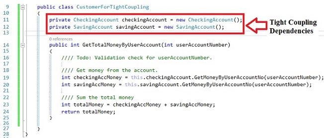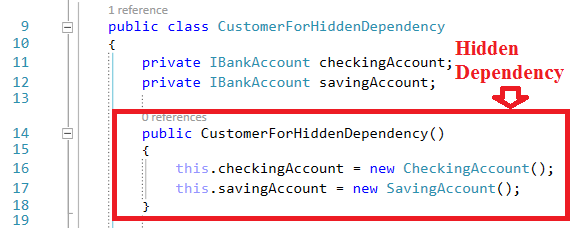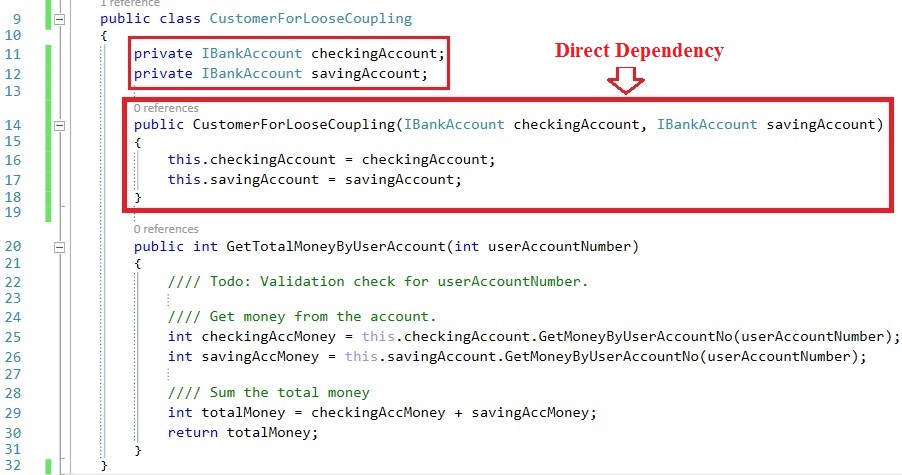 In this example, Customer class uses IBankAccount. It means Customer has a direct dependency on IBankAccount. So, it is called direct dependency.