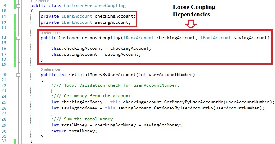 In the example, the implementation of the interface IBankAccount are CheckingAccount and SavingingAccount which are loosely coupled in the customer class. You can inject any different implementation of the IBankAccount into the Customer class.