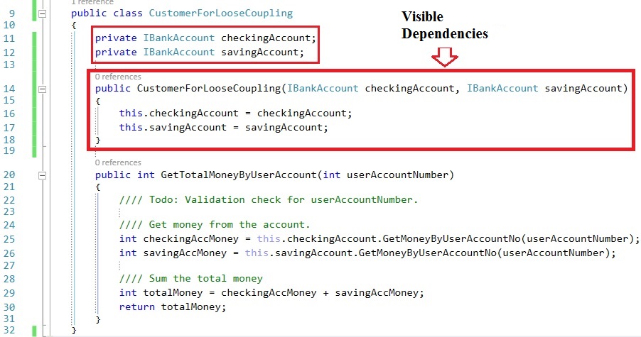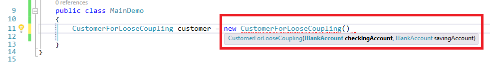 Now if you create an object of the Customer class then you will not get any chance to inject any of the implementation of the IBankAccount Interface. It is hidden during object creation.