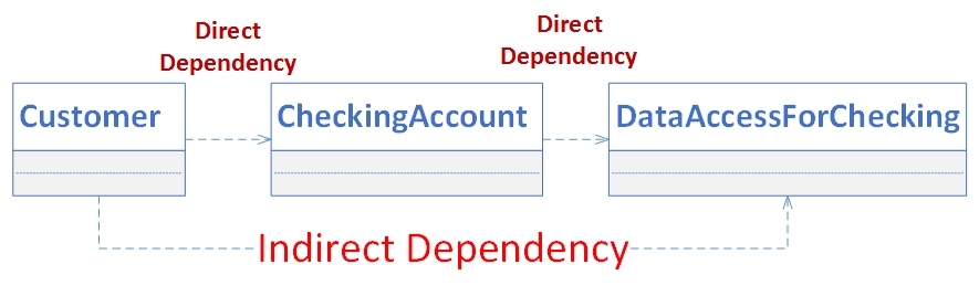 So, Customer has a direct dependency with CheckingAccount. Again Checking Account has a direct dependency with DataAccessForChecking. So, Customer lass has an indirect dependency with DataAccessForChecking.