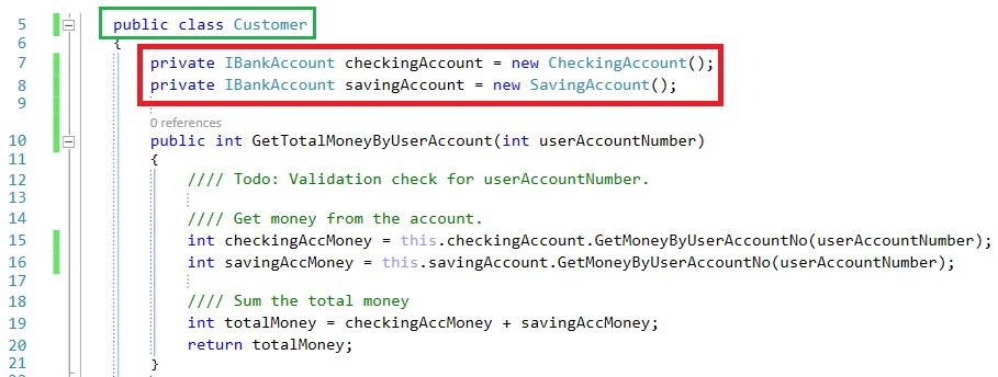 - "Customer" Class can't do its work without classes 'CheckingAccount' and 'SavingAccount'.