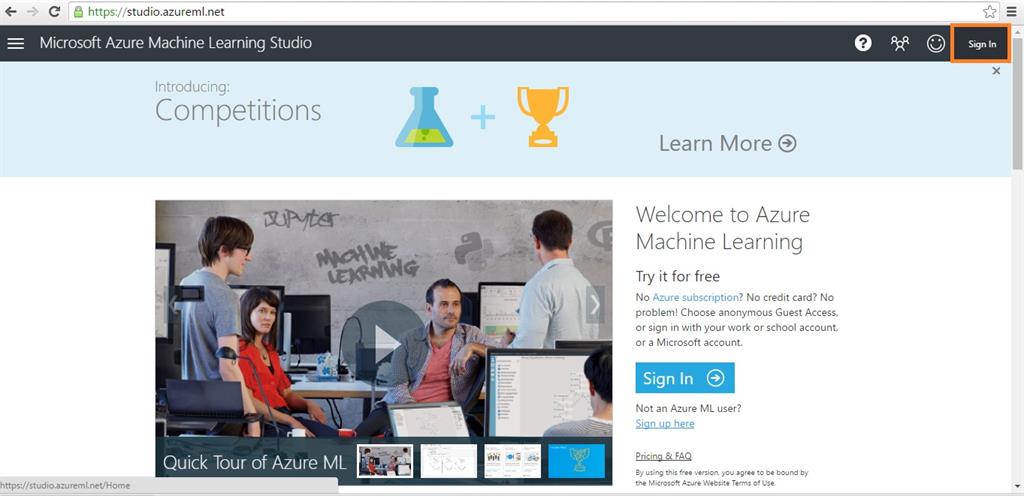 Firstly, open Azure Machine Learning Studio using the following Web address, then click the Sign In button and sign in with your Microsoft account.
