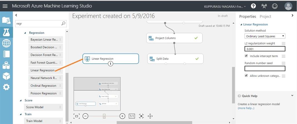 Search and drag the Train Model module to the experiment canvas from the Train Category. Connect the left input port to the output of the Linear Regression module. Connect the right input port to the training data output (left port) of the Split Data module.