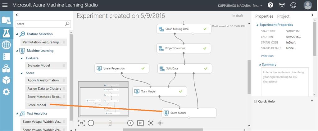 Next, Drag the Score Model module to the experiment canvas and connect the left input port to the output of the Train Model module and then connect the right input port to the test data output (right port) of the Split Data module.