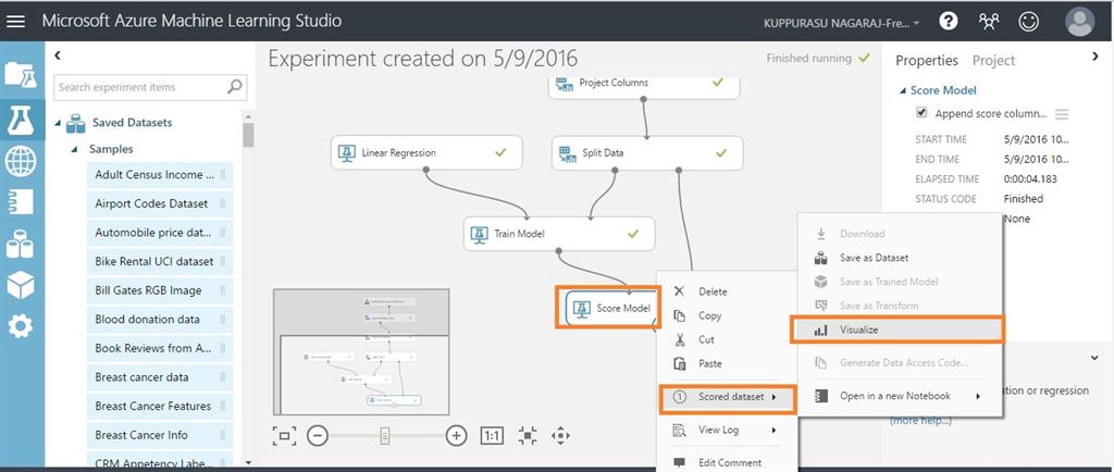 To run the experiment and view the output from the Score Model module, click the output port, and then select Visualize.