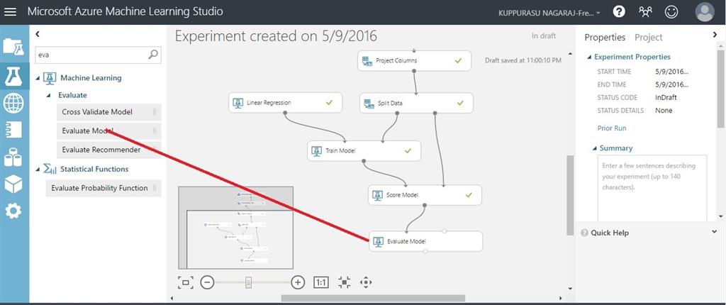 Finally, to test the quality of the results, select and drag the Evaluate Model module to the experiment canvas, and connect the left input port to the output of the Score Model module.