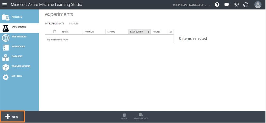 For creating a new experiment by clicking + NEW at the bottom of the Machine Learning Studio window, select EXPERIMENT, and then select Blank Experiment.
