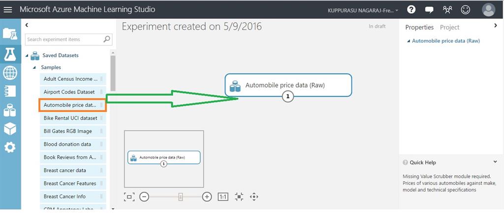 Then drag the Sample dataset from Saved DataSets, Sample, then Automobile Price data (Raw) to the experiment canvas,