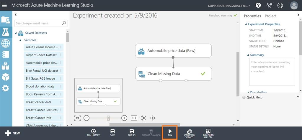 Select the Train Model module, click Launch column selector in the Properties option, and then select the price column. This is the value that our model is going to predict then click Run the experiment.