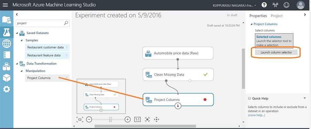 Now Add the project Columns module to the experiment canvas and click Launch column selector.