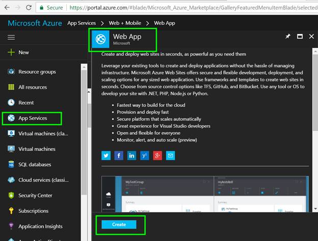 From the next screen, click on "Create". You may want to take a moment and read the text shown on the screen. I personally admire the Azure capabilities to even host PHP, Node.js, or Python and many more application types.