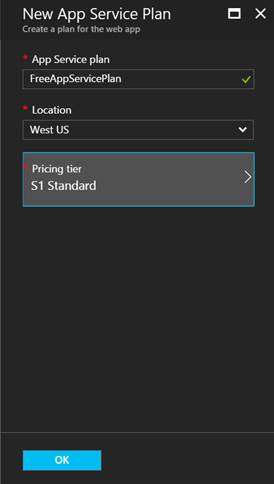 Verify the details and click OK, and now your “Web App” pane will pop up and show the changes applied to your App Service Plan and location.