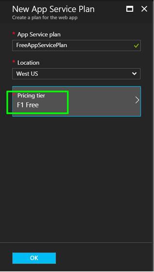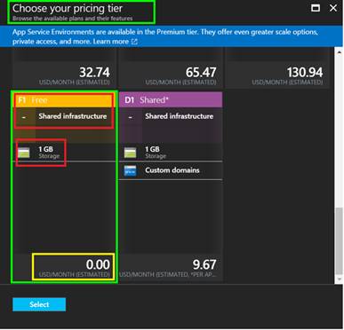 Make note that it offers only 1GB space max, and it will be deployed on a shared infrastructure i.e. there might be other websites hosted under the same IIS / Infrastructure. Also, note that it clearly and explicitly calls out 0.00 cost per month, i.e., it’s completely free and for life. Click on “F1 Free” tier and click "Select". Now, “App Service Plan” pane will update to reflect the changes.