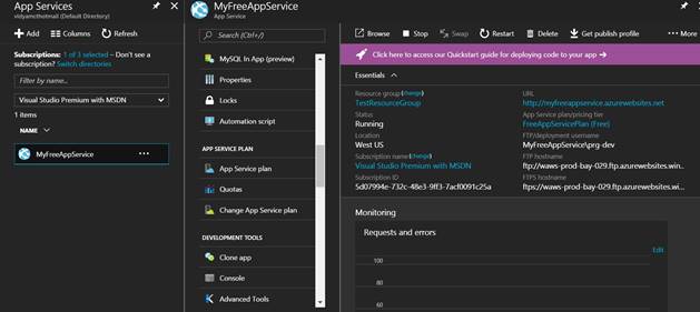 Click on the “MyfreeAppService” to explore this App Service and a whole new pane with lots of options will load, as shown below.