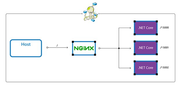 Here, we will see a very simple example of docker compose with 3 ASP.NET Core Web Applications containers and one NGINX reversed-proxy Server container, which will load-balance HTTP traffic and port-forward among these 3 Web apps, using docker compose. We will be using Docker 1.12 for this demo.