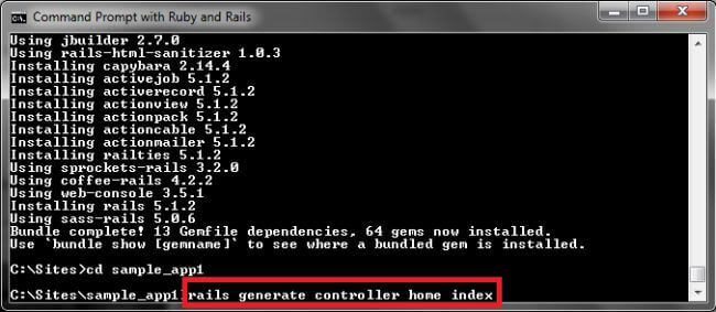 - Now, we generate controller and view but before you generate the controller, you must enter the application folder by using simple cd/ command. Then, generate the controller using this code in Ruby on Rails command prompt.