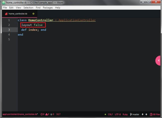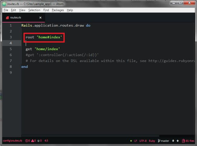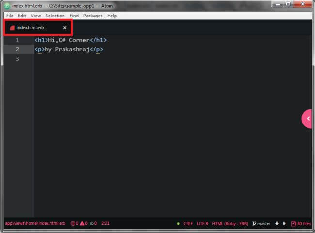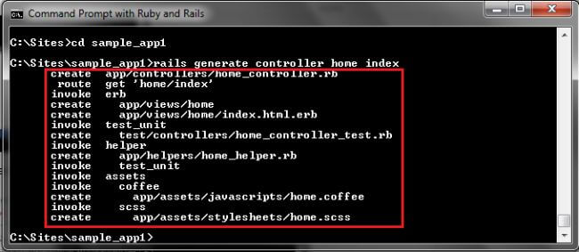 - The views (index) file is created successfully. Now, you can find the views file located at C:/Sites/Sample_app1/app/views/home/index.html.