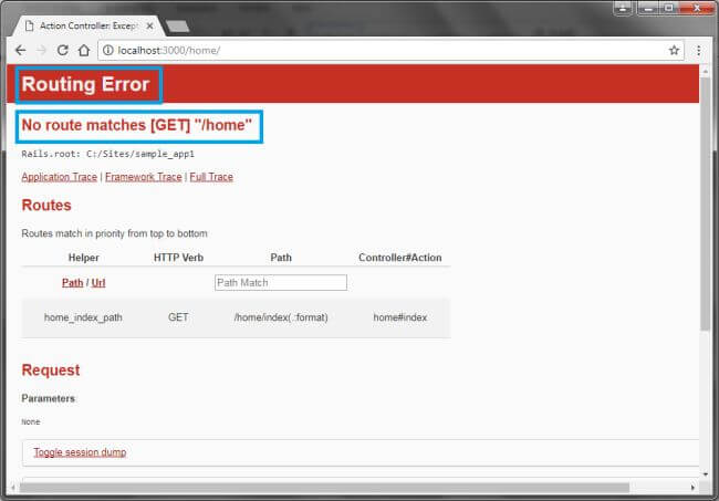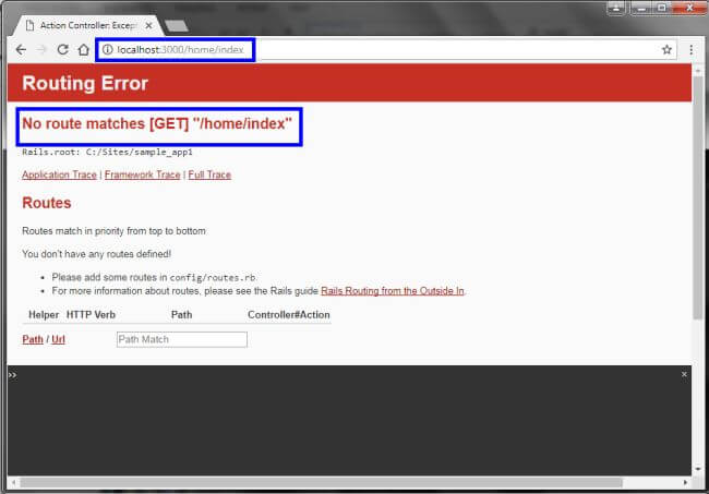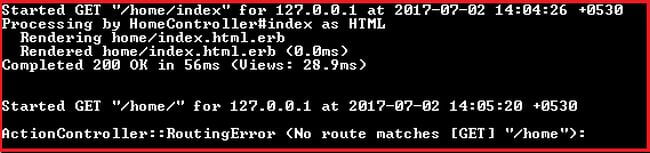 - Now you can check in the web browser http://locaalhost:3000/home/index. It shows routing error because the routing GET ‘home/index’ command is missing in routing file so it can’t find actual path so it helps the Rails framework. It shows a routing error which means the request file is not matching in routing file.