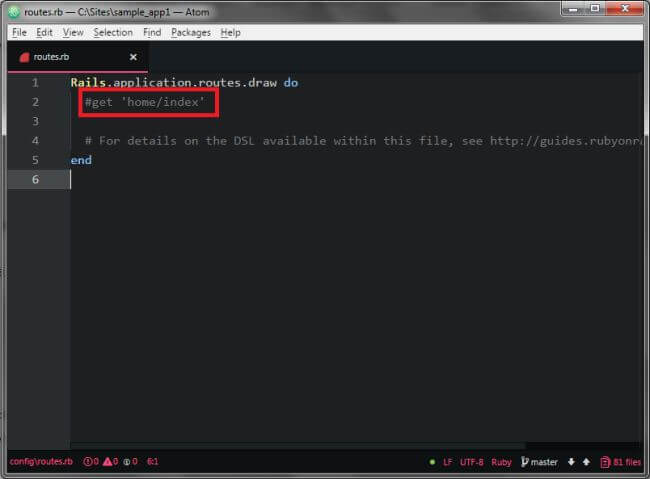 - Now open the Route.rb file you will see the get ‘home/index’ so the index file will run without routing error in browser.