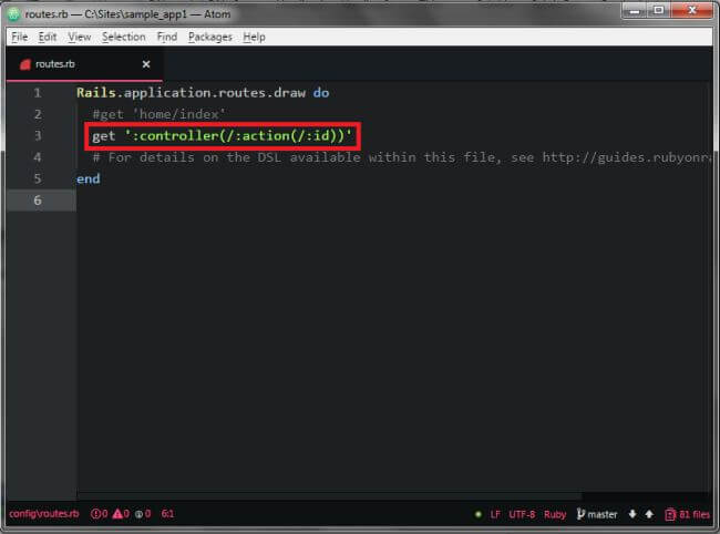 - The route file is created successfully. Now, you can find the route file located at C:/Sites/Sample_app1/config/route.rb.