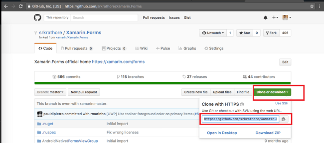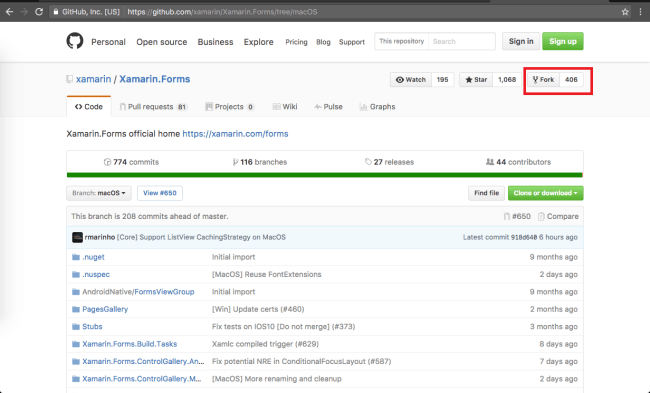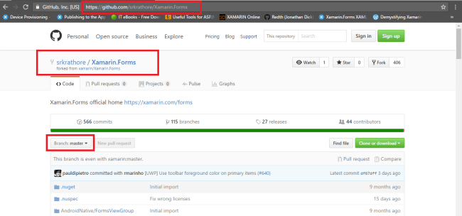 From Twitter itself, I came to know that there is a separate branch for macOS in Xamarin.Forms Github Repository (Branch Link). I wanted to contribute to this library so I forked it (for those who are new to GitHub, the term forking means copying a Github repository from someone else's public repository to your GitHub account. This way the actual user will work on his copy and you will work on your own), but to my dismay, the copy which was created for my user was of a master branch of the Xamarin.Forms repository, not the macOS one. Later, I learned that forking creates a complete copy of the repository you forked in your account along with the all its branches. Now, the question arises, how will you work on the branch you want to work on, in my case the MacOS branch?