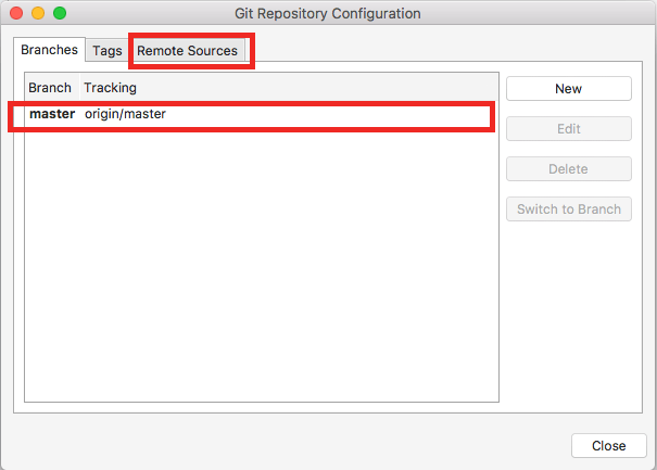 The previous step will open the following window. You can see that by default, the "Branches" tab is selected, which shows all the branches cloned locally and it will be master, by default. Click on ‘Remote Sources’ tab as highlighted.