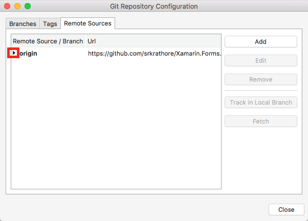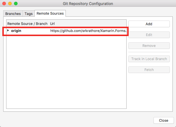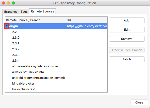 ‘Remote Sources’ tab will show the origin collapsed in Remote Source / Branch with URL, as below.