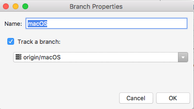 The following window will appear once you click on macOS branch in Switch to Branch option. Enter your details (your GitHub username and email) and click OK button.