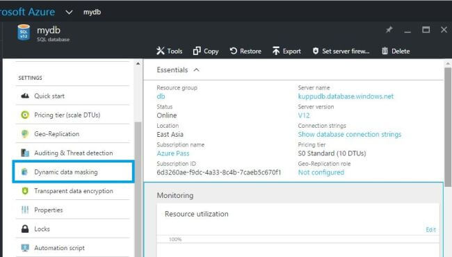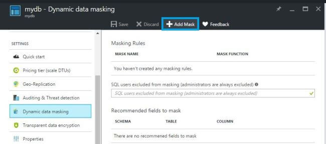 Open the existing database on Azure portal. Click the Dynamic Data Masking tile which launches the Dynamic Data Masking configuration blade.