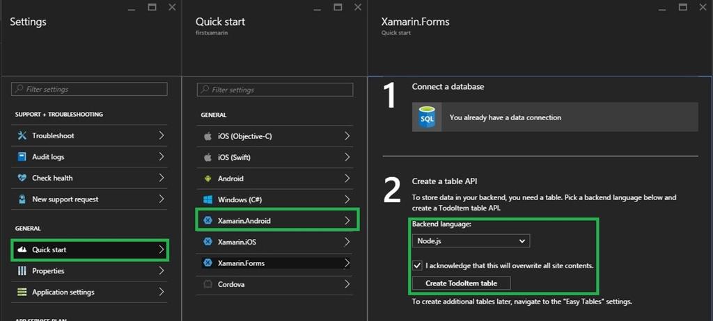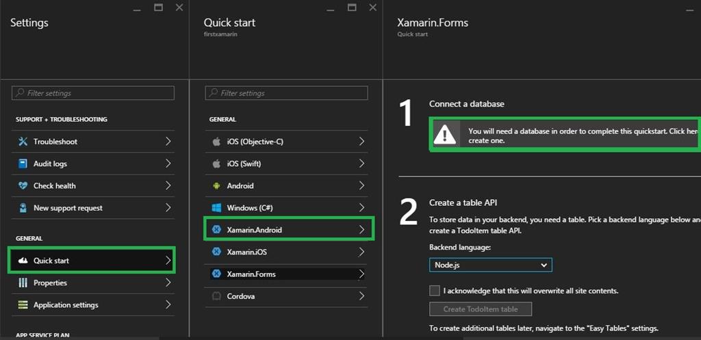 In the Settings blade for the new Mobile App backend, click Quick start > your client app platform (Xamarin.Android) > Connect a database.