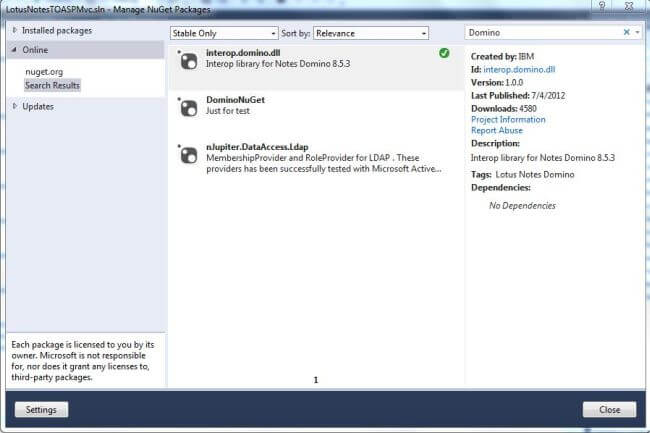 Now, you can see the dialog Window, which contains "Installed packages"(already installed components), Online (Get components from online). Click Online tab and search the text as "Domino" in search box. Select the "Interop.Domino.dll" and click install button to add the Domino component in our reference folder.