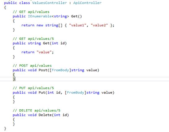 In Web API, we use default action methods. Get, Post, Put, and Delete are four default action methods. When we add new Web API empty controller in our project, the above mentioned action methods are added by default along with some overloaded methods. Look at the below screenshots.