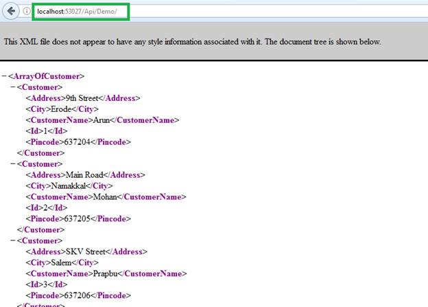 Now build web API and run following URL format “localhost:portNumber/api/Api_controll_Name” we can see the XML output. For in our project run following URL http://localhost:53027/Api/Demo/ looks like below.